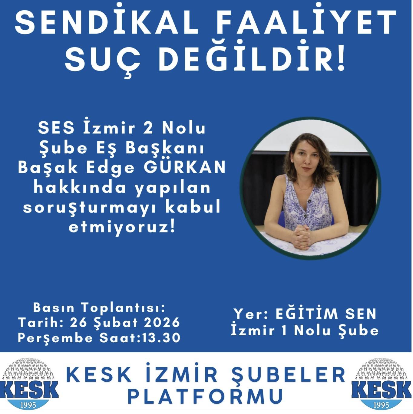 Şu an SES İzmir 2 No’lu Şube Eş Başkanı olan Başak Edge Gürkan hakkında KESK’in aldığı sendikal eylem kararına katılması nedeniyle soruşturmaya tabi tutulduğu bildirildi. KESK’ten yapılan açıklamada, “Önceki dönem KESK sözcümüz  +Başak Edge Gürkan arkadaşımızın Konfederasyonumuz KESKin almış olduğu sendikal eylem kararına katılması nedeniyle sorustumaya tabi tutulması, sendikal hakların kısıtlanması konusunda basın açıklaması yapılacaktır” denildi. (BSHA – Bilim ve Sağlık Haber Ajansı)